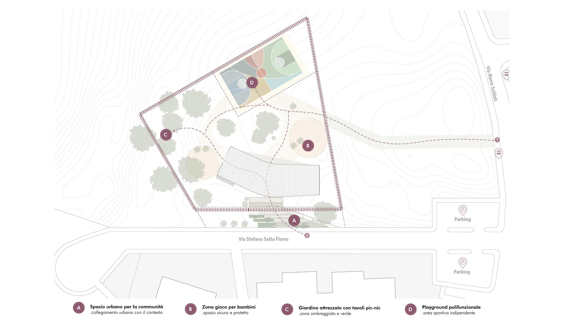 L’edificio, a pianta concava, abbraccia il giardino del parco ed è caratterizzato da una struttura portante in legno lamellare e copertura in XLAM, che consente grandi luci e spazi interni flessibili. Il parco si articola in aree sportive, ludiche e di sosta, collegate da percorsi permeabili e immersi nel verde, con un progetto paesaggistico orientato alla biodiversità e alla bassa manutenzione.