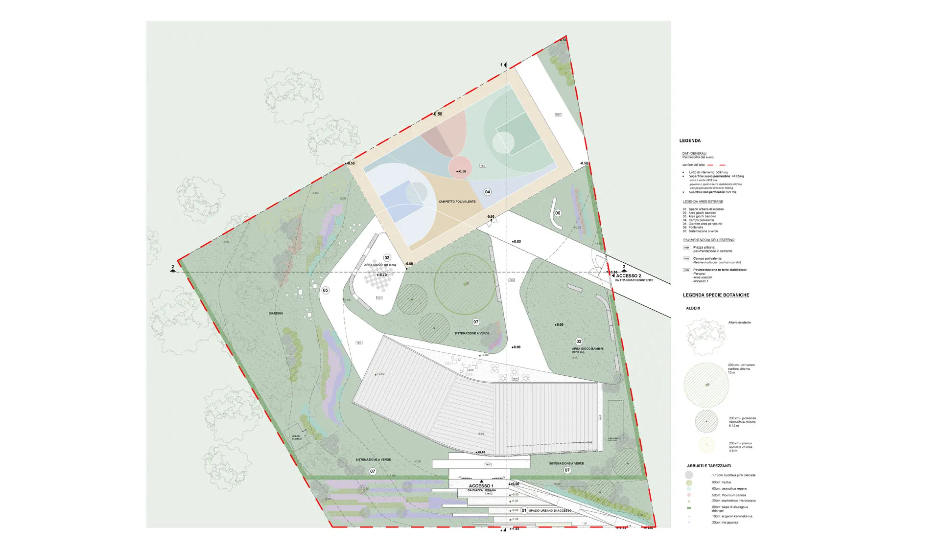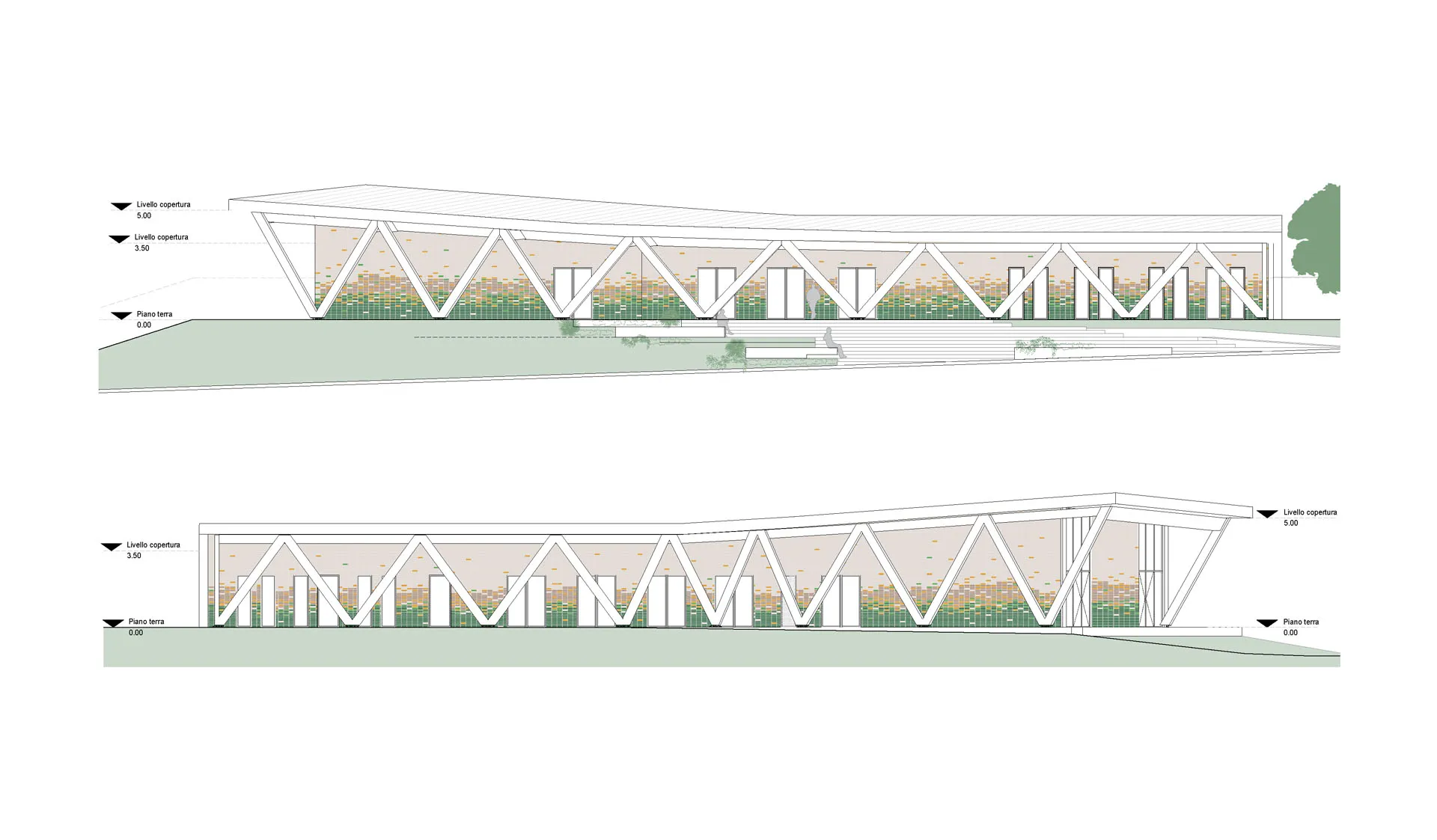 La facciata in ceramica colorata, nei toni del verde e dell’ocra, crea un dialogo visivo tra edificio e natura. Gli spazi interni comprendono hall, punto ristoro, aule, servizi accessibili e una sala polifunzionale per 80–100 persone.