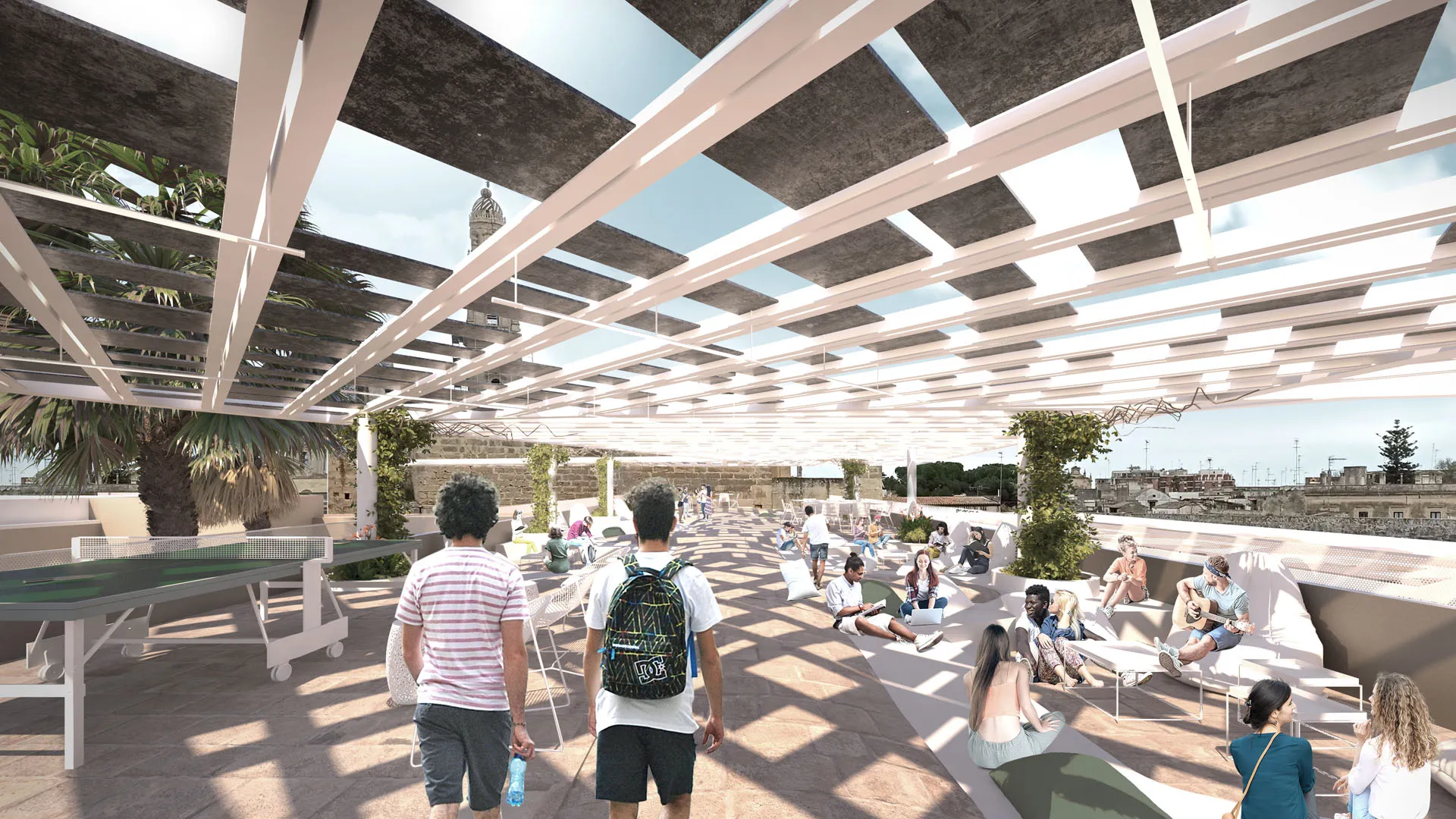 Il percorso pubblico collega via Libertini e via Basseo al cortile centrale, trasformato in un vero giardino mediterraneo con palme, vegetazione locale e una fontana che richiama l’antico pozzo. In questo spazio si inserisce una struttura indipendente in metallo bianco traforato, composta da scala, ballatoi e ascensori, che garantisce l’accessibilità a tutto l’edificio e conduce a un nuovo spazio pubblico in copertura. Qui una passeggiata ombreggiata, con pergole dotate di pannelli fotovoltaici integrati in elementi ceramici, dialoga con il paesaggio urbano e la vegetazione.