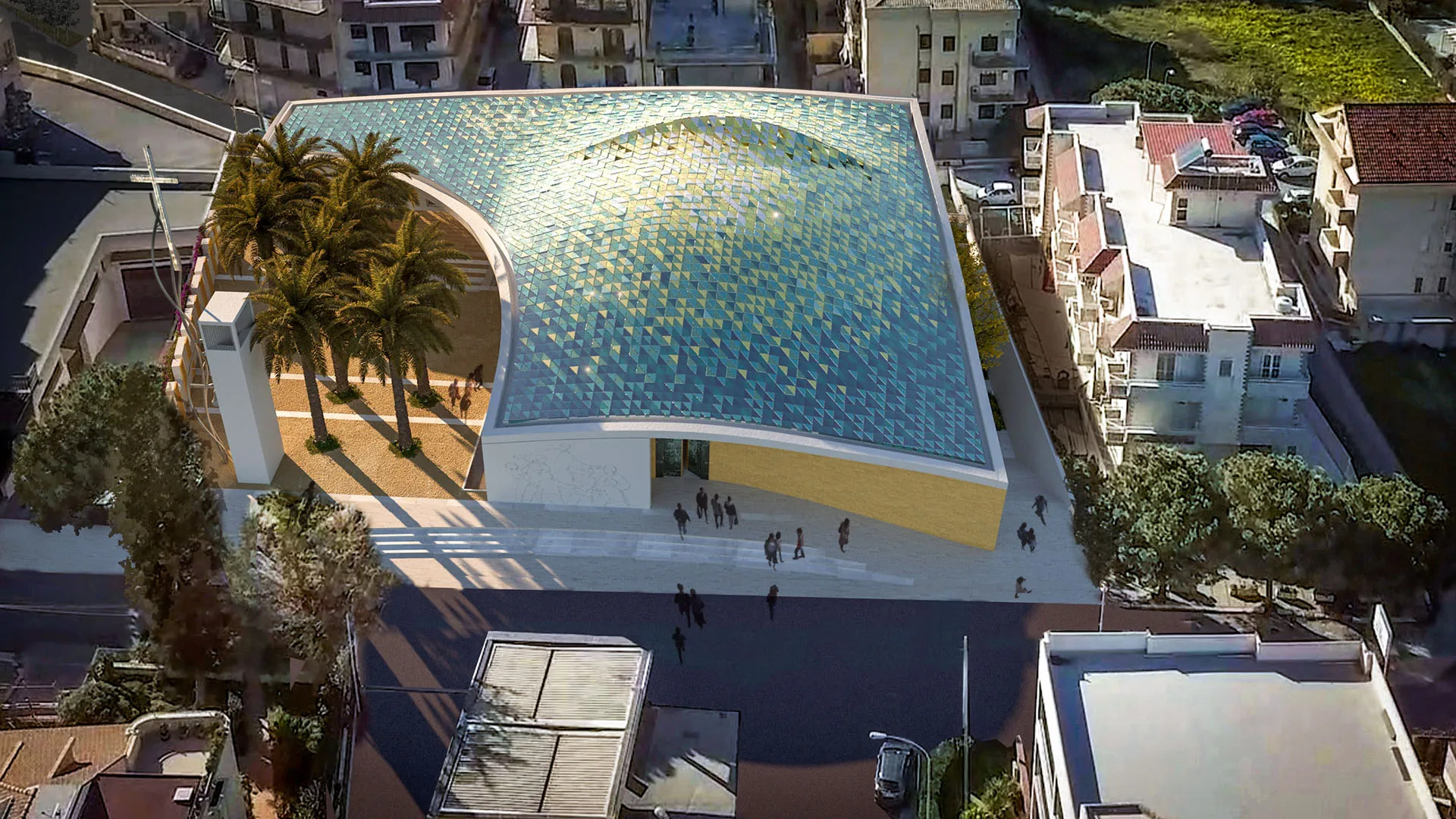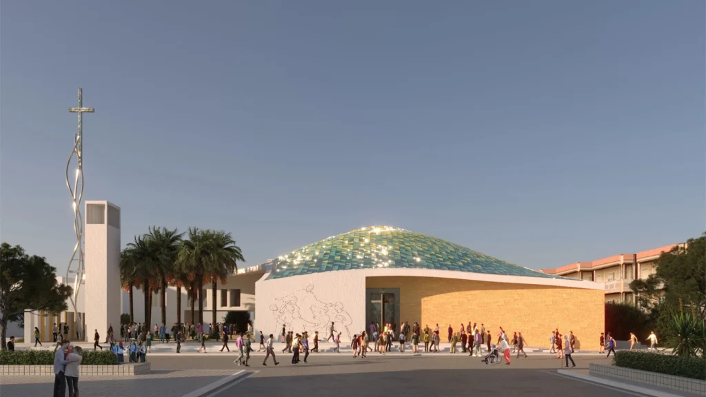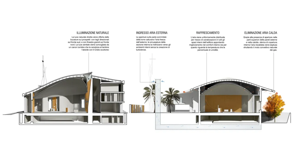 Vengono reinterpretati in chiave di sostenibilità contemporanea alcuni elementi tradizionali dell’architettura mediterranea. La tipologia della chiesa a pianta centrale appare la più idonea per questa comunità che esprime l’esigenza di partecipazione assembleare. Gli spazi stereometrici si articolano su una pianta quadrata ed un prisma a sviluppo orizzontale, il tutto racchiuso e convogliato sotto un’unica avvolgente copertura che nasce dall’archetipo della cupola. Quest’ultima, partendo dalla ricca tradizione storica e culturale del territorio palermitano, si mostra come morbida reinterpretazione di una cupola siciliana. La sua ceramica colorata, vibrante e brillante è fortemente visibile riprendendo i colori tradizionali dei giardini di Bagheria, configurandosi quasi come un tessuto prezioso di un drappo intarsiato.