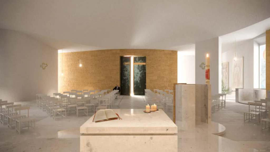 Composizione: capogruppo: chvl architetti_ Arch. Christian Rocchi e arch. Valeria Caramagno, partners: arch. Giampiero Lilli, arch. Francesco Stapane, liturgista: dott. Aurelio Garcia Macias, artisti: Piero Casentini, Jacopo Lilli, Renderizzazioni e video: Liraat _ https://www.liraatvisuals.com/