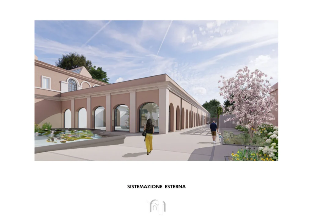 Il progetto degli spazi esterni infatti si pone, in continuità culturale, con la memoria del giardino del Valadier, inteso come nodo di connessione tra la parte antica di Villa Poniatowski, fabbrica ottocentesca per la lavorazione delle pelli, e il futuro spazio culturale multifunzionale che si intende realizzare.