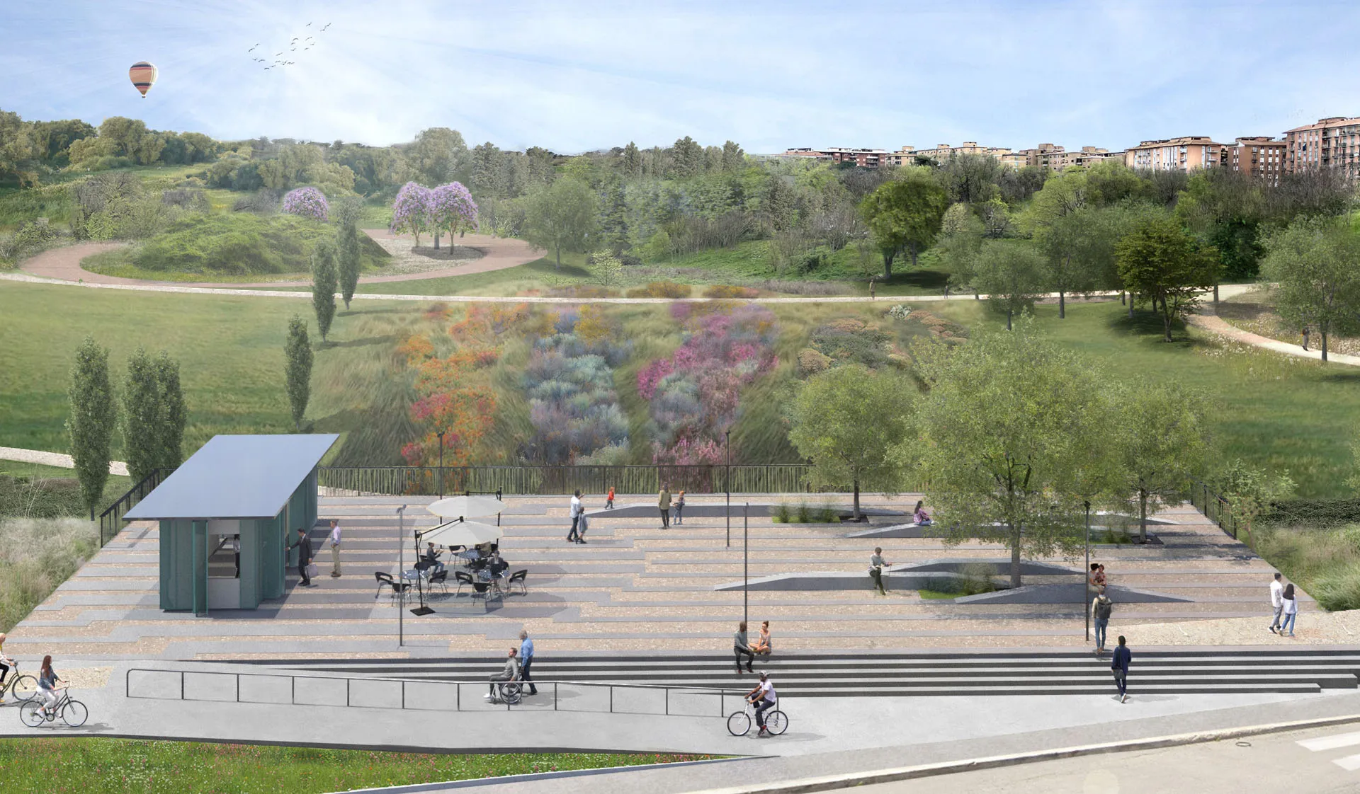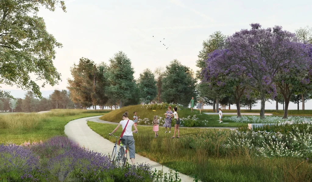 Si realizzerà uno spazio aperto e vivibile per tutti i cittadini che raccoglie sia il flusso dei percorsi pedonali che di quelli delle due piste ciclabili (la parallela lungo via Papiria e quella ortogonale da via Marco Fulvio Nobiliore) e li convoglia verso i nuovi percorsi del parco che saranno raccordati a quelli in corso di realizzazione.