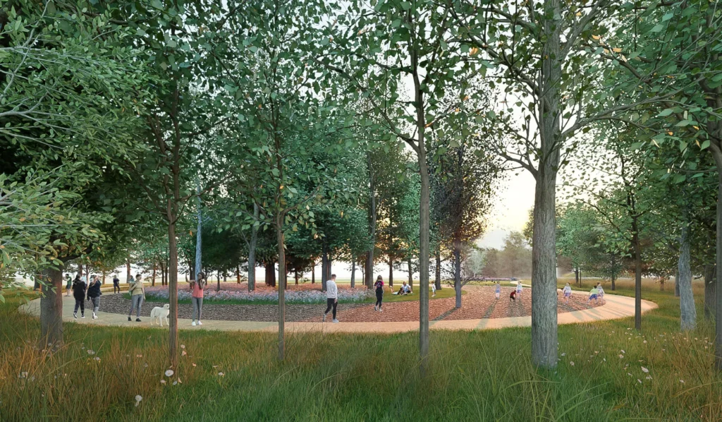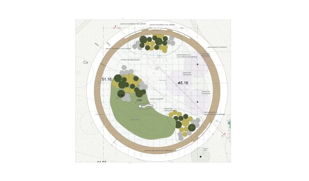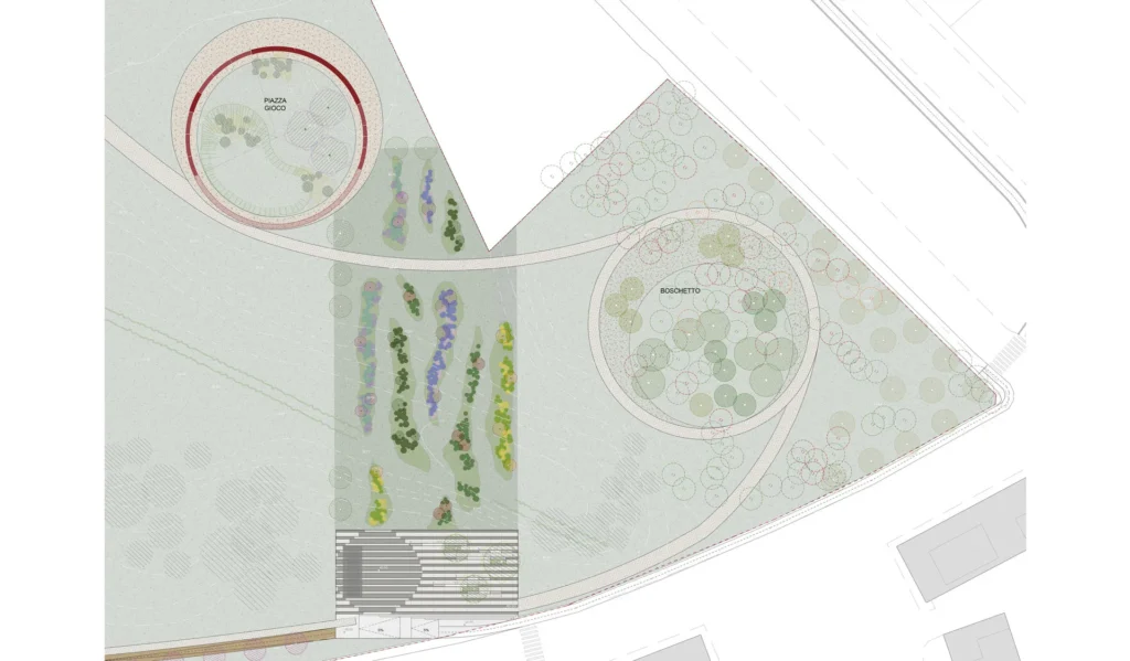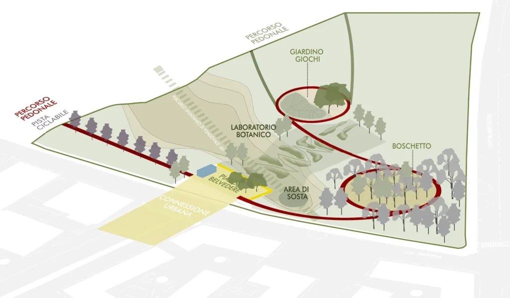 La realizzazione dello spazio pubblico di accesso sud al parco è pensato come una piastra urbana che da un lato costituisce il terminale di un asse stradale chiaramente leggibile, dall’altro diventa un trampolino che lancia lo sguardo ad abbracciare lo spazio naturale del parco. In tal senso si prevede la realizzazione di una piazza pubblica all’ingresso sud del parco, affacciata su un’area naturale potenziata come laboratorio botanico.
