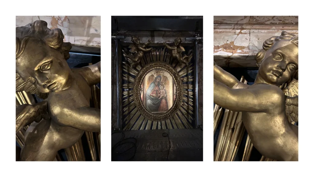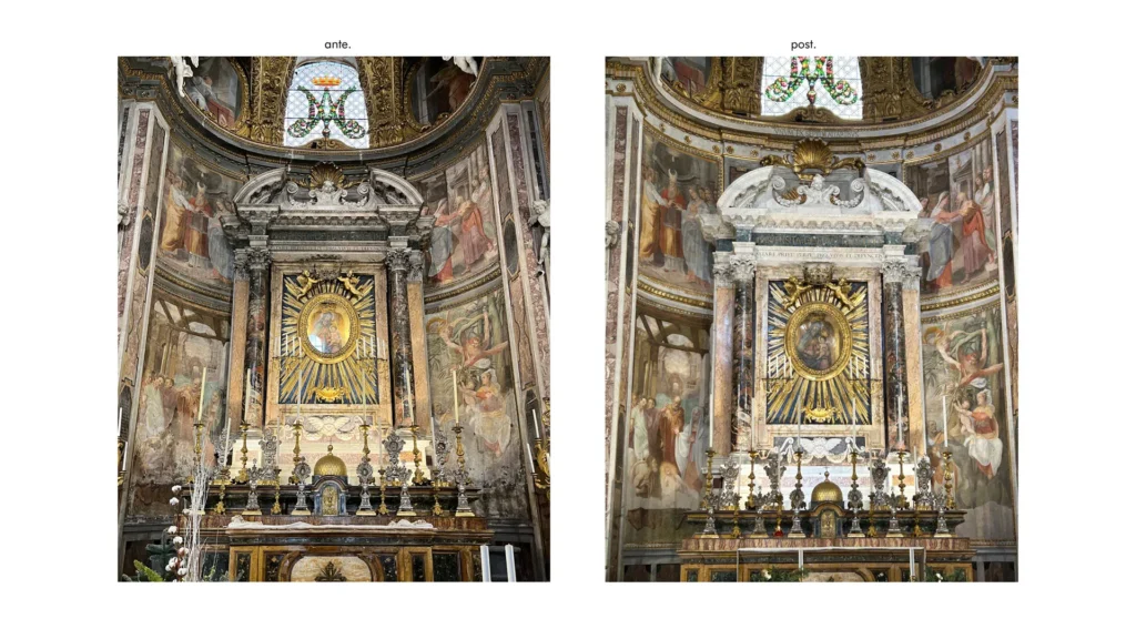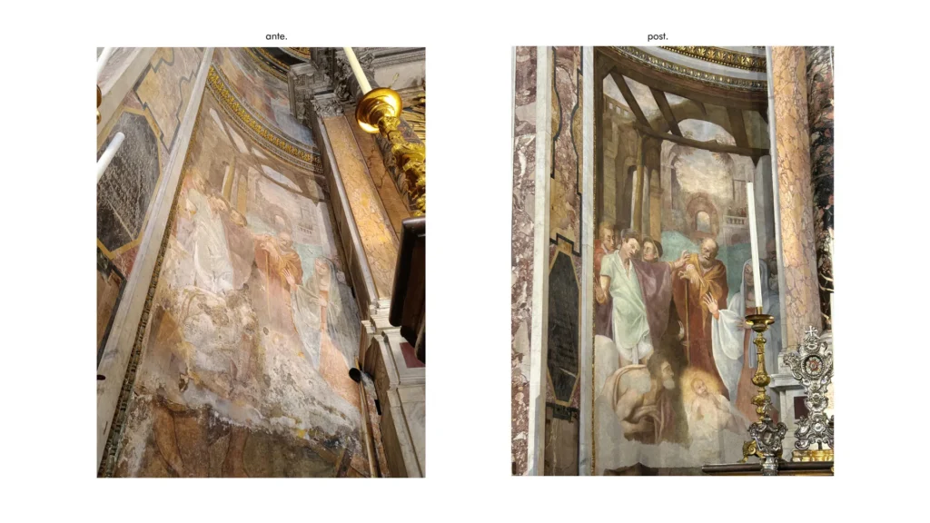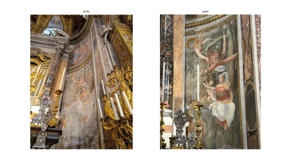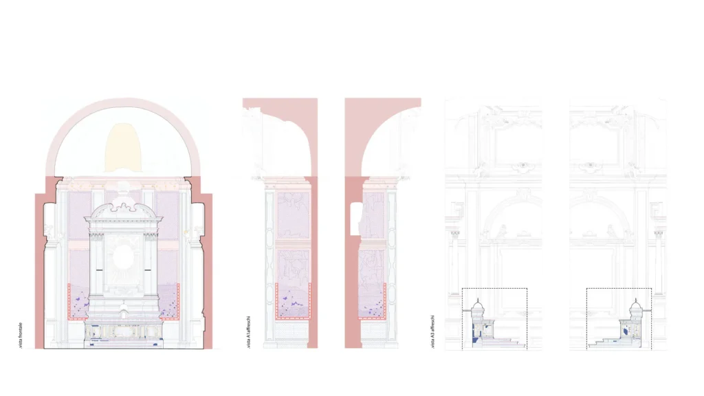 Il restauro ha coinvolto tutto l’appartato decorativo del catino absidale: marmi policromi, dipinti murali, stucchi dorati. L’esito del lavoro è di nuova valorizzazione e riscoperta degli elementi decorativi, fino alla tram narrativa del ciclo pittorico.