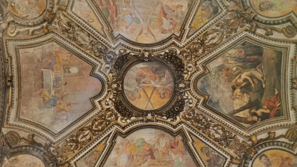Nel 1618-1619 Innocenzo Tacconi realizzò i dipinti murari della volta, suddivisi in cartelle entro cornici in stucco: vi sono rappresentate scene della vita di Sant’Andrea, gli Evangelisti, l’Annunciazione e episodi della vita di San Francesco e di Santa Francesca Romana.
